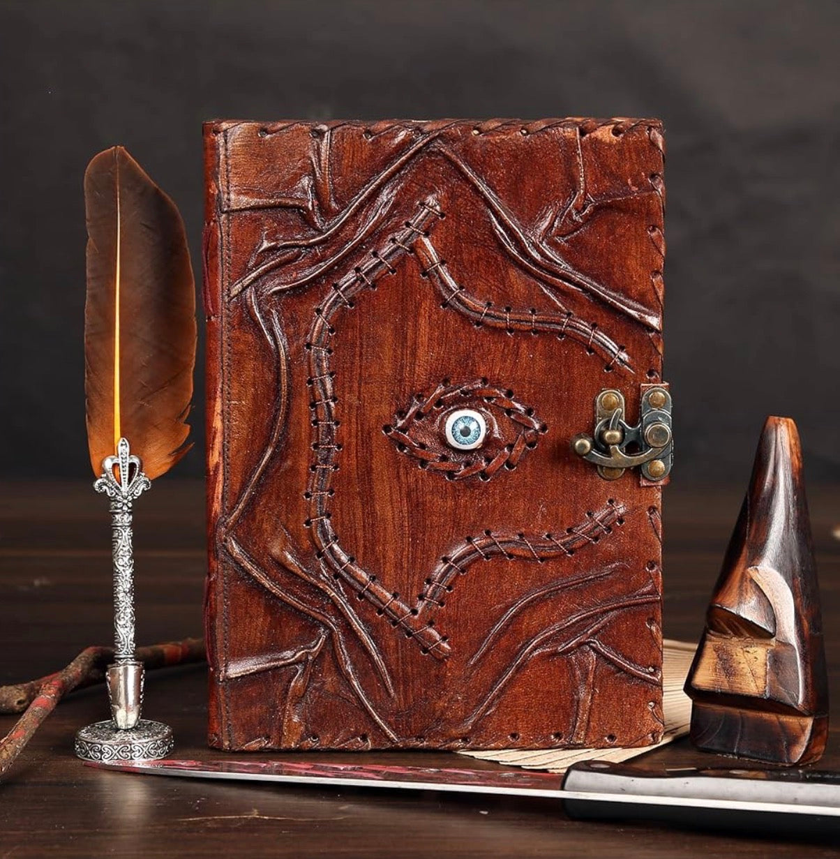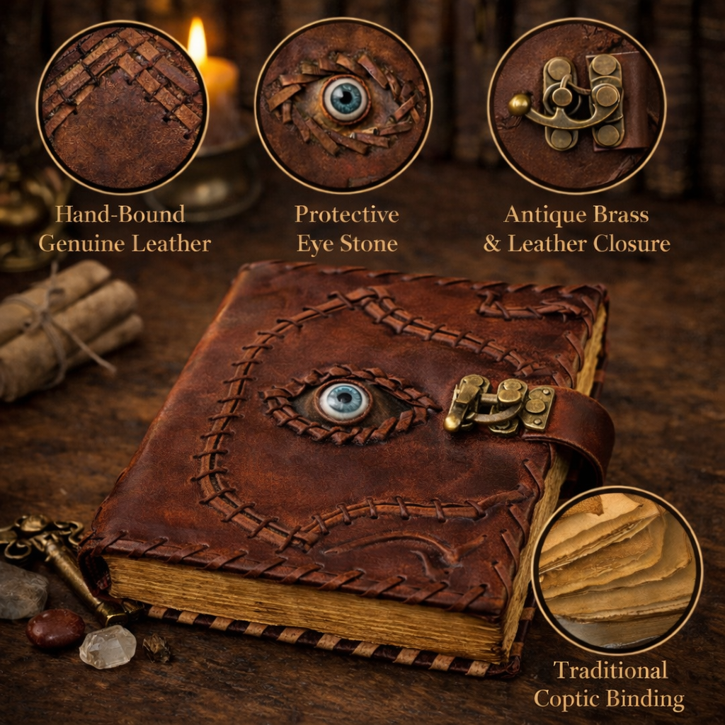 Bound in genuine leather and detailed with an eye stone for protection and awareness, this book is designed to be both beautiful and meaningful. The antique brass closure keeps your work secure, while the traditional Coptic binding allows the book to lay flat for effortless writing or ritual use.